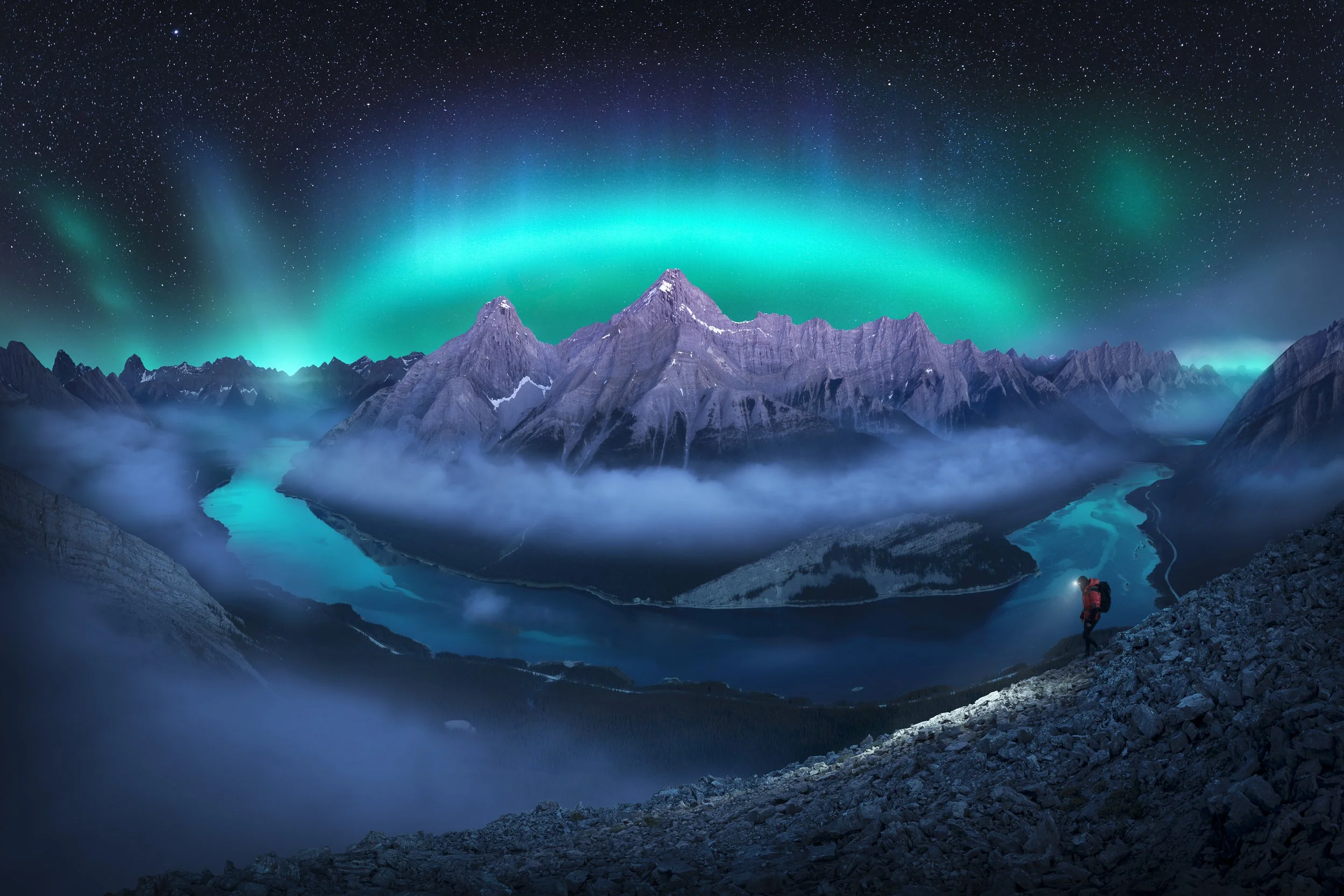 A year later, I had permanently moved to Canmore. One night, the northern lights forecast was promising and so therefore I headed to a nearby viewpoint. It was the strongest aurora I had ever captured in the Canadian Rockies. Its circular pattern arching right above Kananaskis reminded me of the views from Little Lougheed and its round lakes down below. A new image crossed my mind: how compelling would it be to combine both experiences together? Two moments of extreme gratitude… merged into a single art piece.